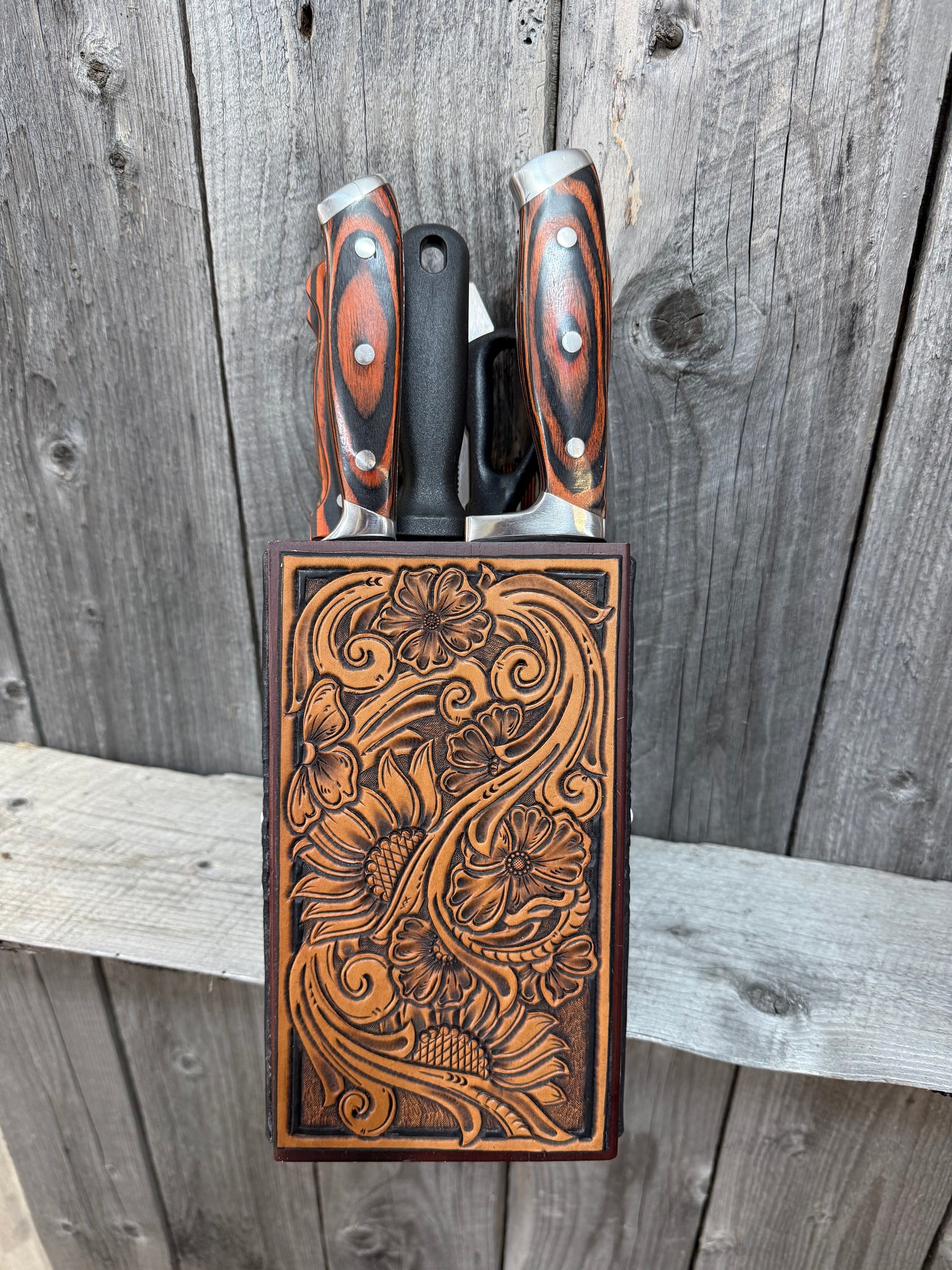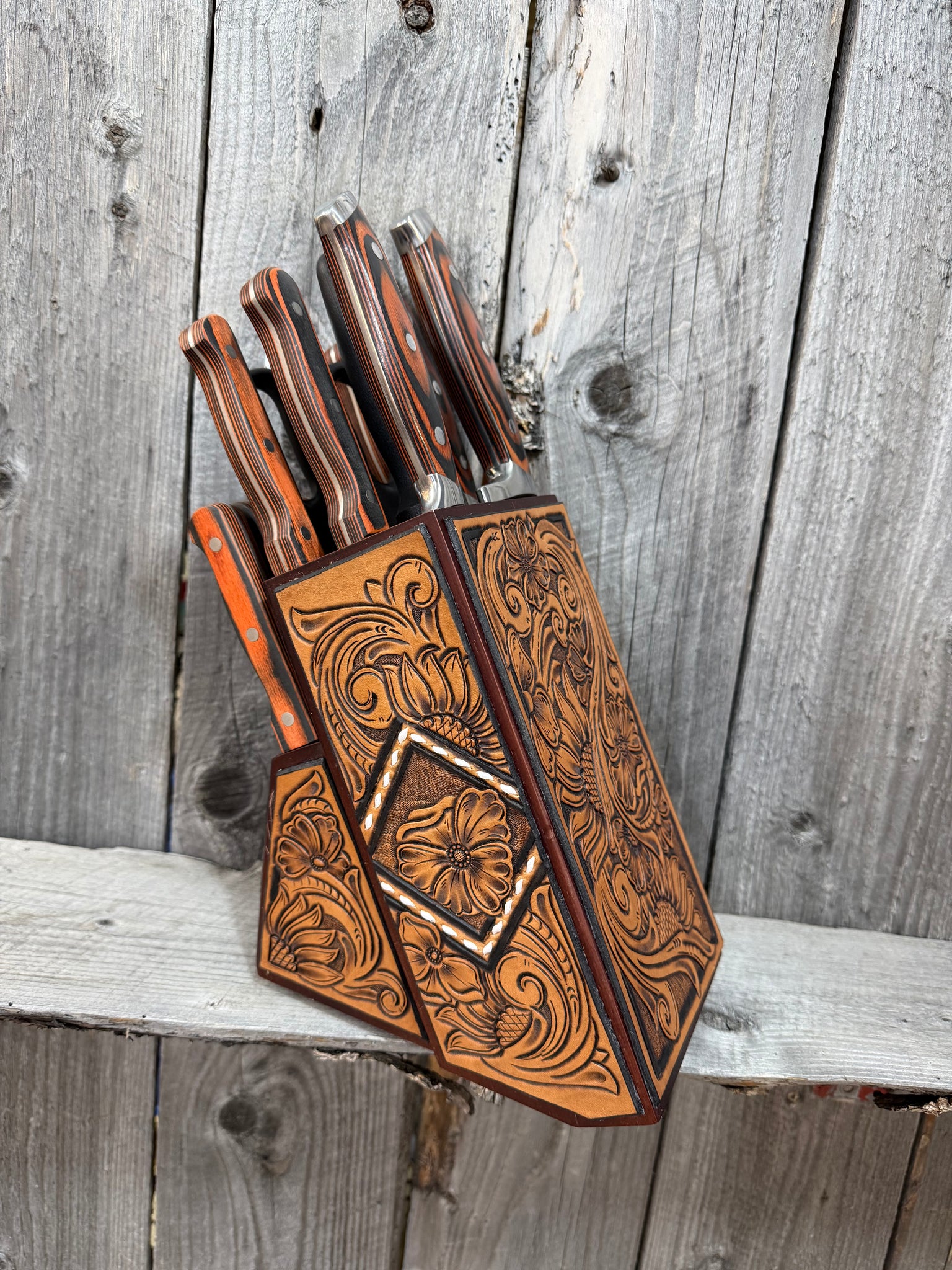 These knife blocks are a huge hit. They feature a wood block with custom tooled leather patches to perfectly showcase this 15-piece set.