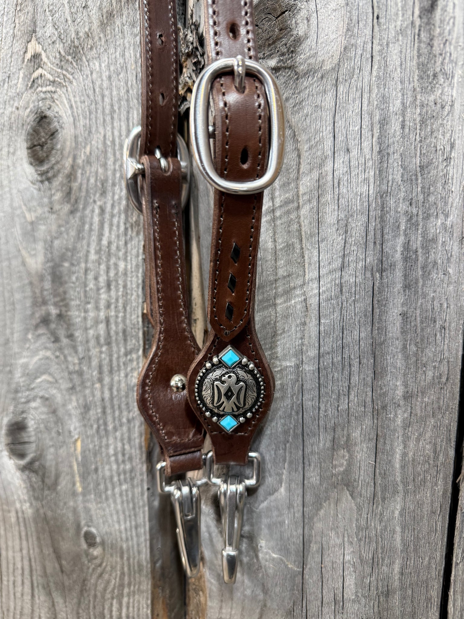 Quick change short cheek bridles with two buckles. Each one features some buckstitch, quick change stainless steel snaps and two buckles